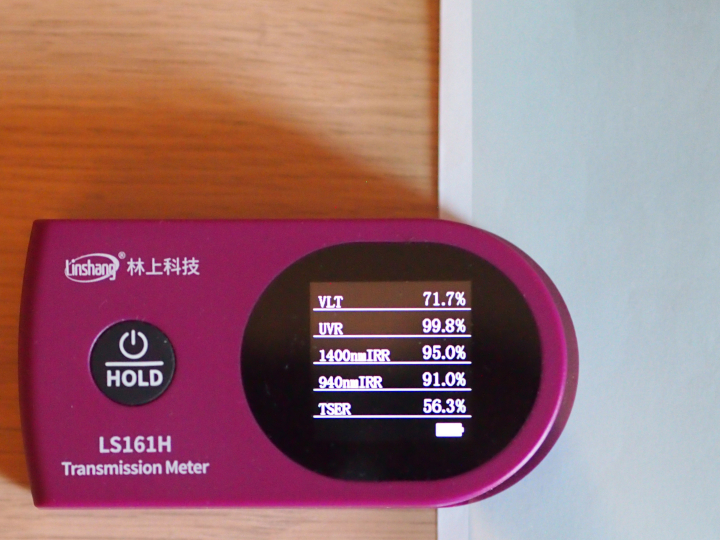 Оптически чистая двуслойная пленка, структура: защита от царапин + 23 мкм прозрачный полиэстер + клей и нитрид титана в наноразмере + 23 мкм прозрачный полиэстер + клей и задерживающий УФ-материал + 23 мкм съёмная защитная пленка.